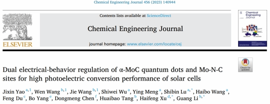 本网讯 近期,公司太阳成官网在能源器件方向取得新进展,相关研究成果以“Dual electrical-behavior regulation of α-MoC quantum dots and Mo-N-C sites for high photoelectric conversion performance of solar cells”为题发表在国际著名期刊《Chemical Engineering Journal》上。太阳成官网为第一完成单位,学院姚吉鑫博士为第一作者。《Chemical Engineering Journal》期刊影响因子指数16.744,涵盖了工程技术、化工全领域的基础和跨学科领域的应用研究,收录了领域内最前沿的优秀论文。