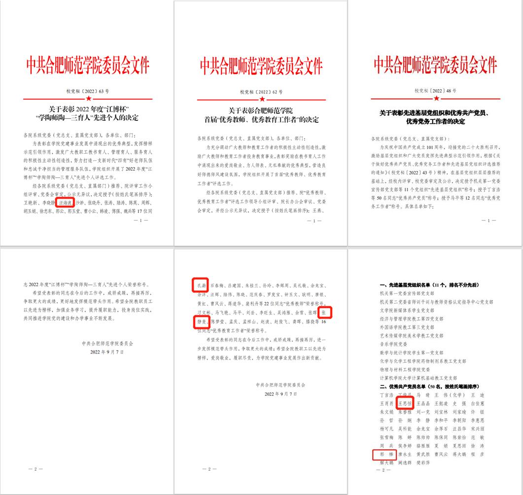 汪海波副教授荣获校2022年度“江博杯”“学陶师陶—三育人”先进个人称号;孔勐副教授荣获校首届“优秀教师”称号;张静斐老师荣获校首届“优秀教育工作者”称号;郭棒、王思恬老师荣获校“优秀共产党员”称号。