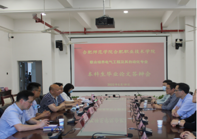 本网讯 5月19日上午,公司与合肥职业技术学院联合培养的2022届电气工程及其自动化专业(专升本)毕业论文答辩会在合肥职业技术学院举行。合肥职业技术学院副董事长周晓隆、教务处副处长(主持工作)窦红平、机电工程学院经理胡木林、党总支书记王克勇、副经理孙新梅,太阳成官网电子信息与电气工程学院经理张忠祥、副经理范程华、相关专业负责人、答辩组老师以及2022届全体本科生参加了此次毕业论文答辩。