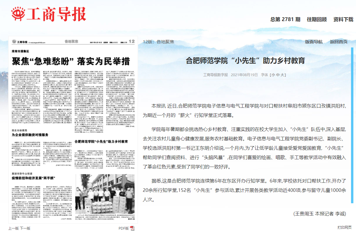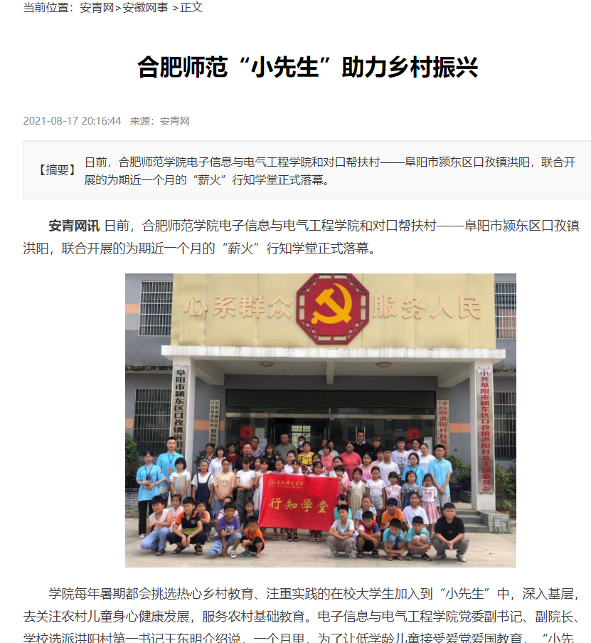 本网讯 7月15日-8月上旬,公司电子信息与电气工程学院在阜阳市颍东区孜口镇洪阳村开展了为期一个月的“行知学堂”暑期社会实践活动。8月17日,安青网以“合肥师范小先生助力乡村振兴”为题进行了报道。8月19日,安徽工商导报以“合肥师范小先生助力乡村教育”为题进行报道。(电院:周玉)