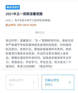 据悉,“五一”节前,学院根据学校学工部门通知要求,已完成员工假期离校登记备案等工作,并由每位辅导员老师将安全温馨提示通过辅导猫APP发送至每一位员工,做到安全教育时时有、线上线下不断档。(电子信息与电气工程学院)