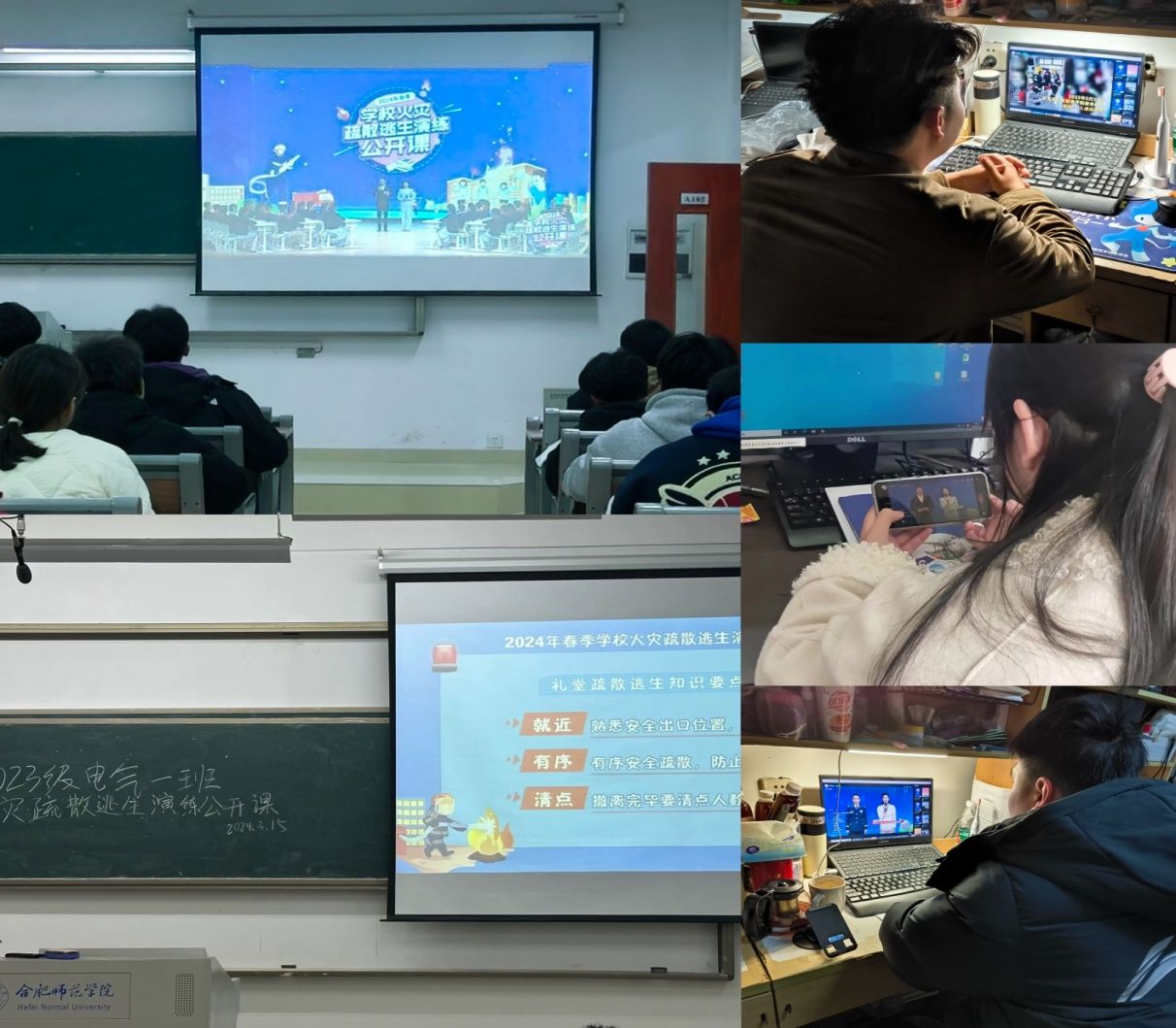 通过“中国消防”微信公众号、微博、抖音等网络媒体,学院组织师生收看《2024年春季学校火灾疏散逃生演练公开课》。公开课结束后,各班级“趁热打铁”利用主题班会向同学们阐述了校园消防安全的重要性、校园生活中常见的火灾隐患和火场逃生自救方法等基本消防安全常识,教育同学们要提高消防安全意识,养成良好的生活习惯。
