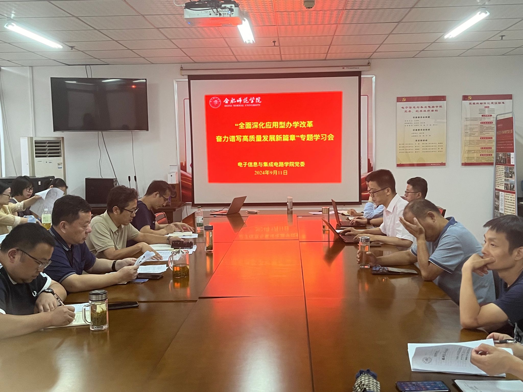本网讯 为深入学习贯彻习近平总书记关于教育的重要论述,引导广大教师弘扬践行教育家精神,为校院高质量发展贡献力量。9月11日下午,电子信息与集成电路公司党委在知行楼1210会议室召开“全面深化应用型办学改革 奋力谱写高质量发展新篇章”专题学习会议,公司党委书记王东明,党委副书记、经理张忠祥,党委副书记、纪委书记胡石清,党委委员、副经理范程华及全体教职工参会,会议由张忠祥主持。