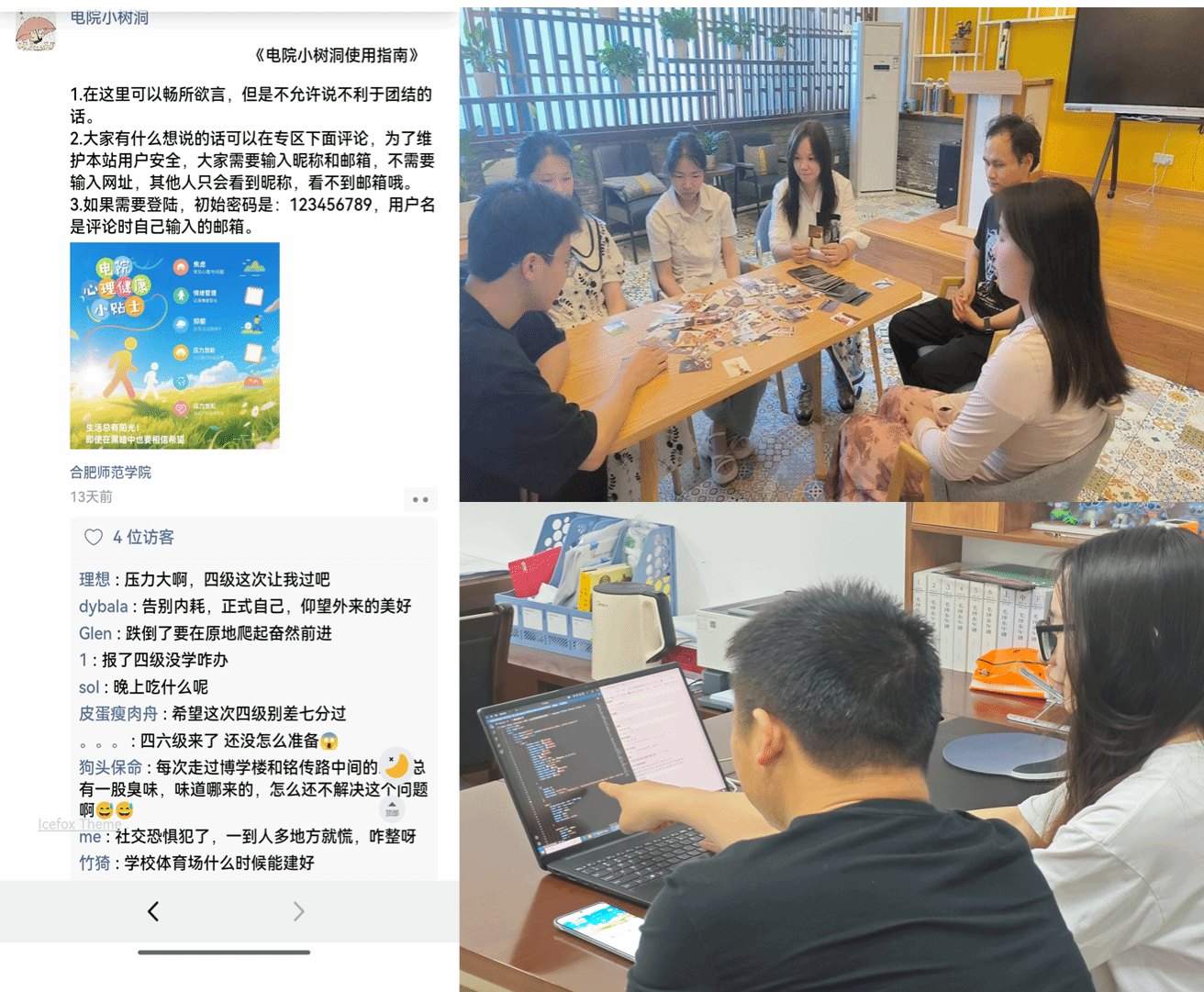 公司充分发挥学科特色,创新推出“‘芯’世界‘心’对话”心理健康教育品牌项目。5月7日至23日,OH卡心理沙龙活动在学院两个校区里陆续举办,活动由国家二级心理咨询师、辅导员周玉和辅导员耿洪宝共同指导开展,累计吸引百余名员工参与。同时,以“你的心事值得被听见”为主题,依托学院专业背景,将编程技能与心理健康教育深度融合,学院员工精心开发了“电院小树洞”心理互助平台,以创新形式为师生搭建起心灵沟通的桥梁,获得广泛好评。