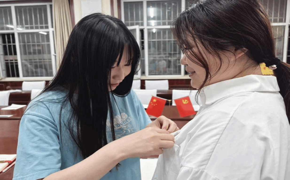 汪媛媛为员工预备党员佩戴党员徽章