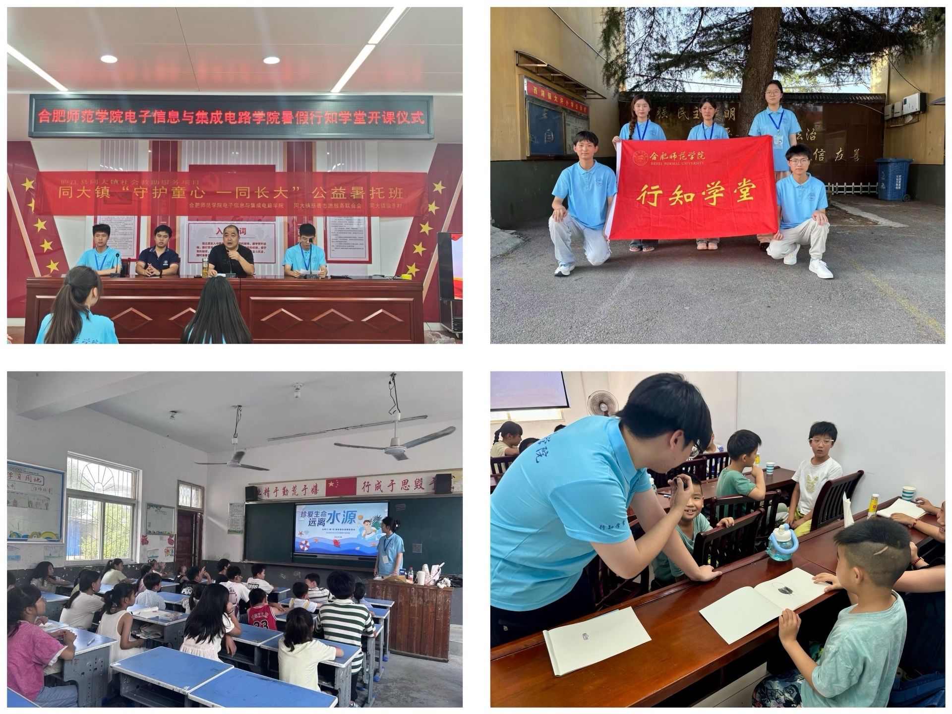 行知学堂开班仪式上,当地政府领导、老师代表、志愿者们以及当地的留守儿童和部分家长齐聚一堂,现场氛围热烈而温馨。志愿者代表发言,表达了将以饱满的热情和负责任的态度投入到教学和陪伴工作中的决心。学堂小先生们精心准备了丰富的课程,包括趣味科学实验、电子小制作、安全教育、文化课辅导、艺术体育活动等,既结合了学院的专业特色,又能满足孩子们的兴趣和需求。