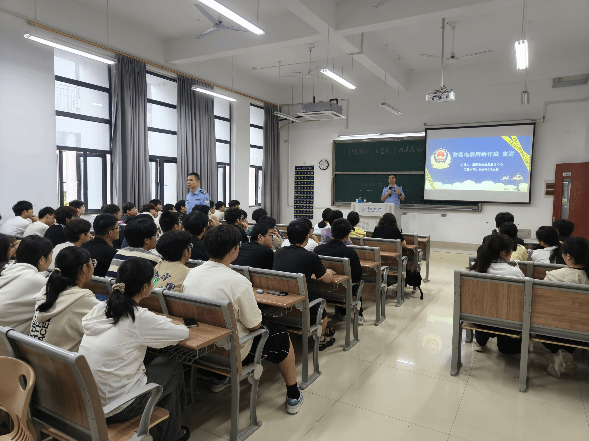 为进一步增强在校老员工防范电信网络诈骗的意识和能力,筑牢校园安全防线。2025年9月26日上午9时,一场以“防范电信网络诈骗”为主题的反诈安全教育主题宣讲在太阳成官网滨湖校区博学楼A106教室召开。本次活动由学校保卫处牵头,太阳成官网组织,特邀巢湖市公安局反诈中心警官担任主讲,为同学们带来了一堂生动的反诈知识普及课。