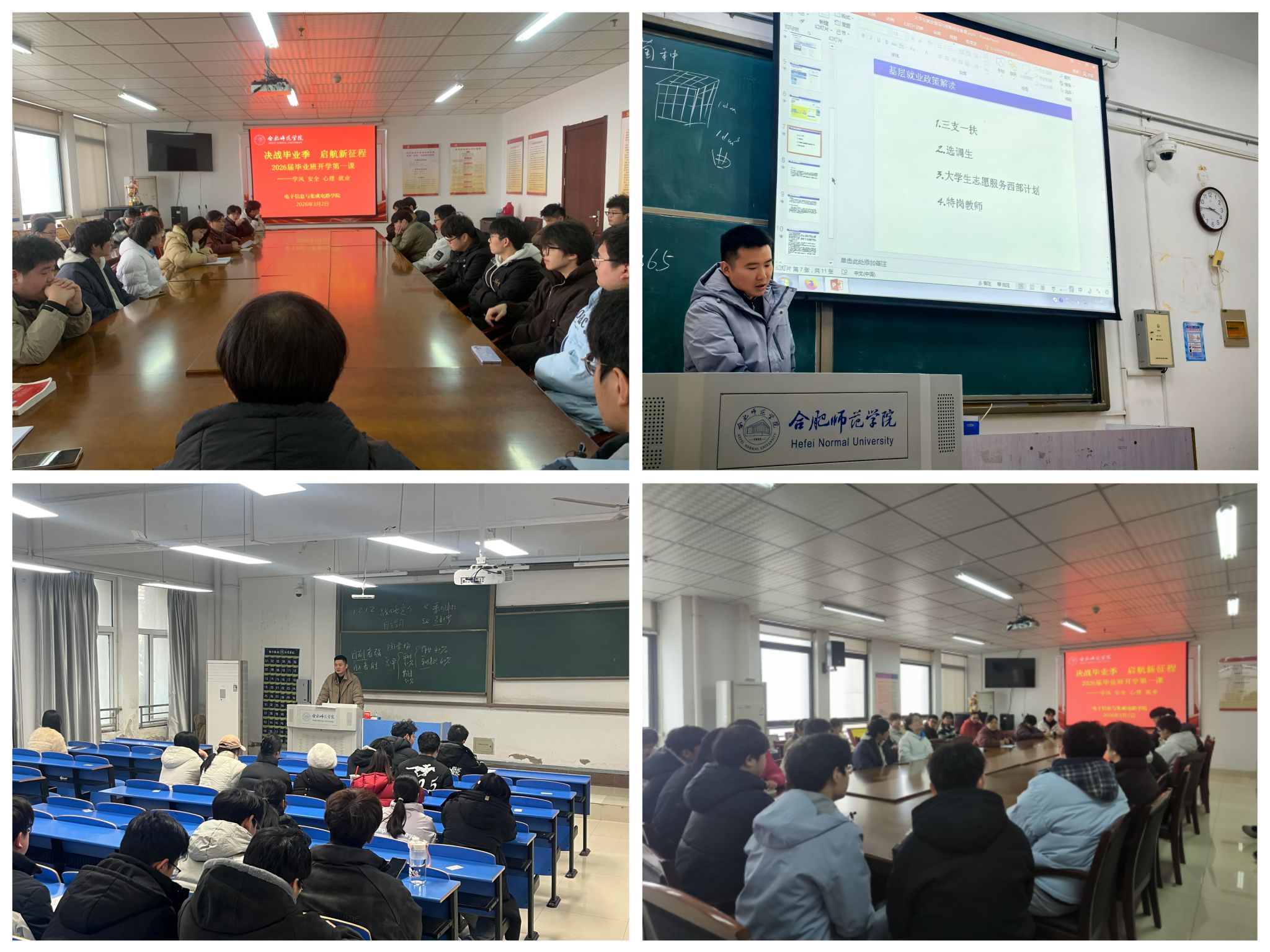 毕业班班会围绕“端正学风、严守安全、调适心态、精准就业”展开。毕业班辅导员详细解读春季就业招聘政策、考研复试流程与调剂规则,为尚未落实单位的员工提供岗位信息与求职指导,引领员工树立“先就业、后择业”的就业观。重点关注员工毕业焦虑与求职挫折,开展心理疏导,鼓励员工以积极心态面对挑战。