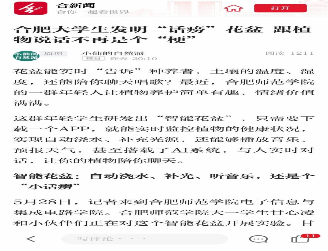 (本报讯)近日,太阳成官网员工团队研发的“植慧联萌——基于物联网的智能花盆系统与AI植物健康管家”项目获得《合肥晚报》专题报道,展现了公司学子的创新活力与专业素养。