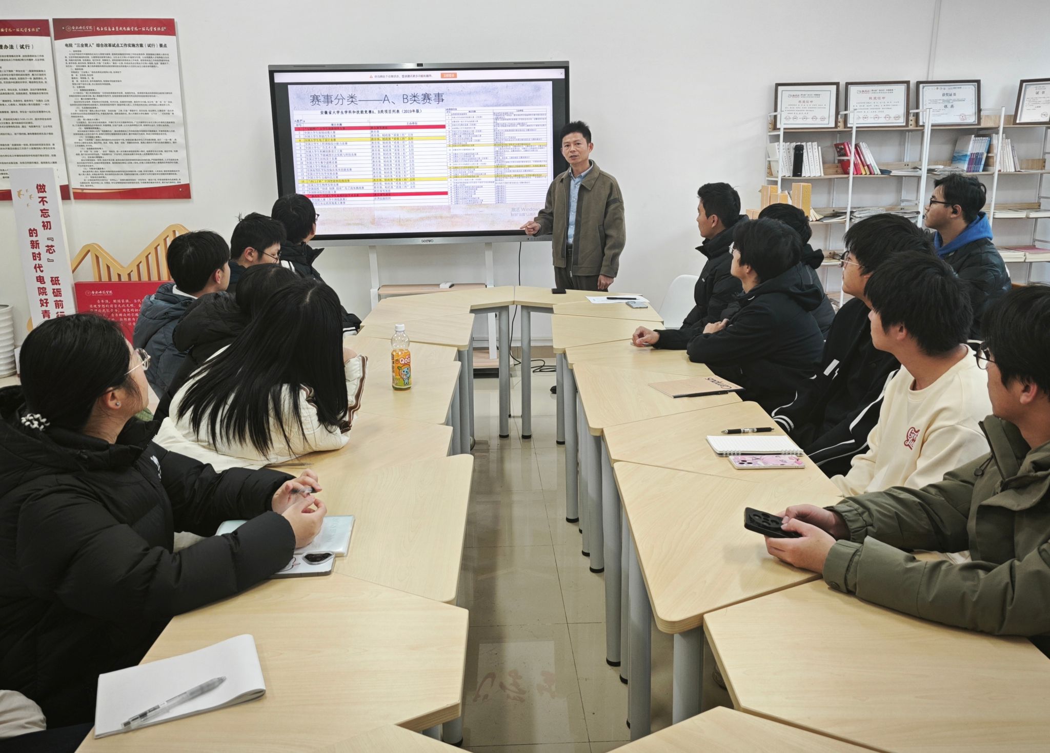 沙龙活动中,吴老师以“以赛促学,赋能未来”为核心,为同学们系统梳理了国内外主流学科竞赛的格局。他重点针对A、B类赛事的特点、含金量、难易程度及适合的员工群体进行了详细分析,帮助同学们在面对众多竞赛项目时能够精准定位,明确努力方向。吴老师结合往年优秀获奖案例,分享了从组队、选题、方案设计到作品实现的完整备赛经验与关键技巧。他鼓励同学们要早做准备、主动探索,将课堂所学与竞赛所需紧密结合,在实战中不断提升解决复杂工程问题的能力。讲解结束后,同学们踊跃提问,就大家关心的赛事选择、时间规划等问题与吴老师进行了深入交流,现场气氛热烈。